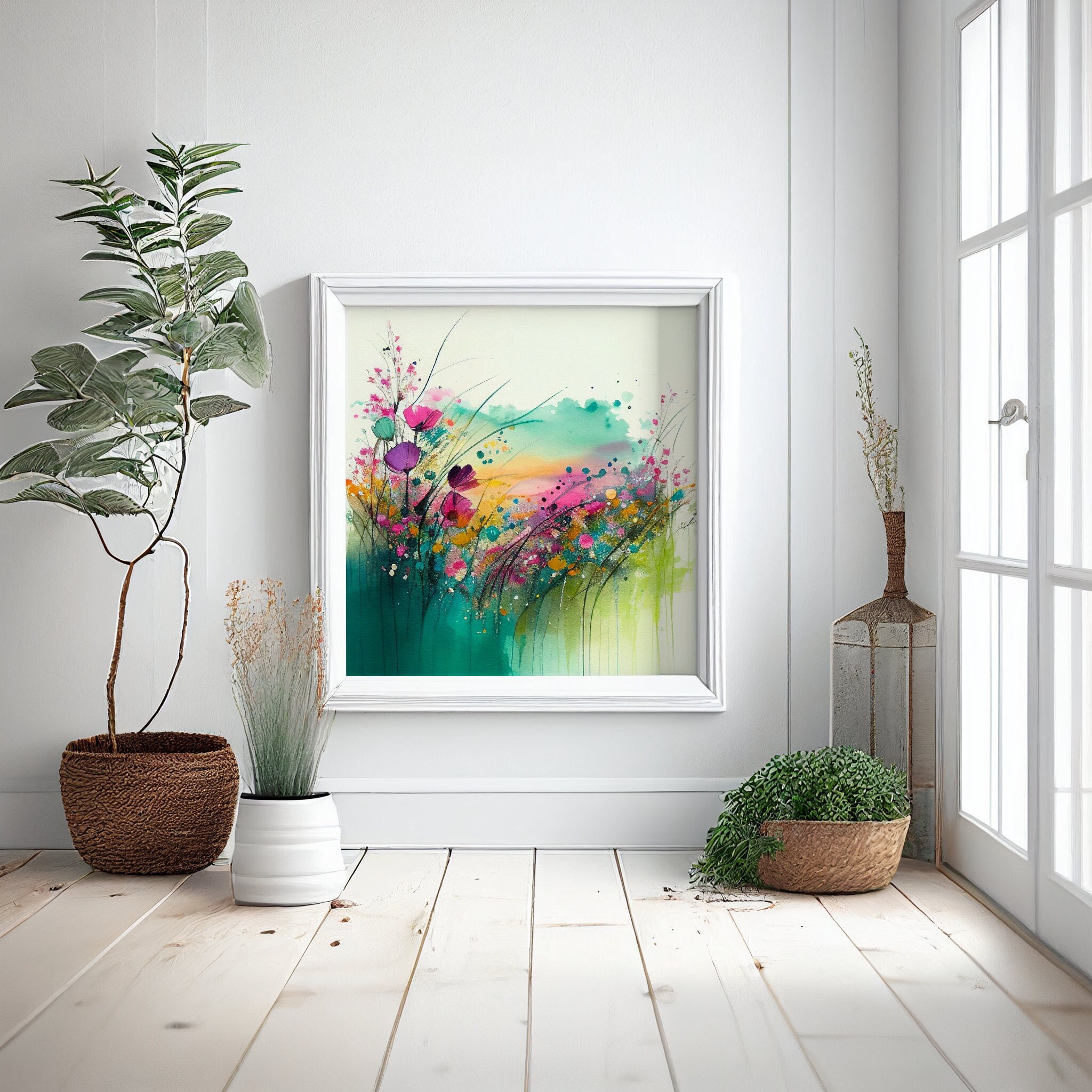 Flower Watercolour Painting of a wildflower meadow landscape, framed prints and canvas prints. Perfect for adding a pop of colour and a touch of whimsy to any room in your home. Flower prints available in a variety of sizes, add a little bit of the outdoors to your indoor space!