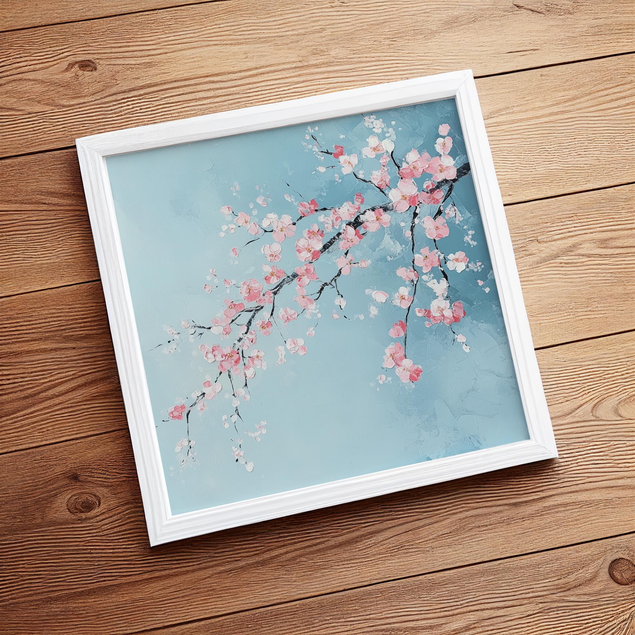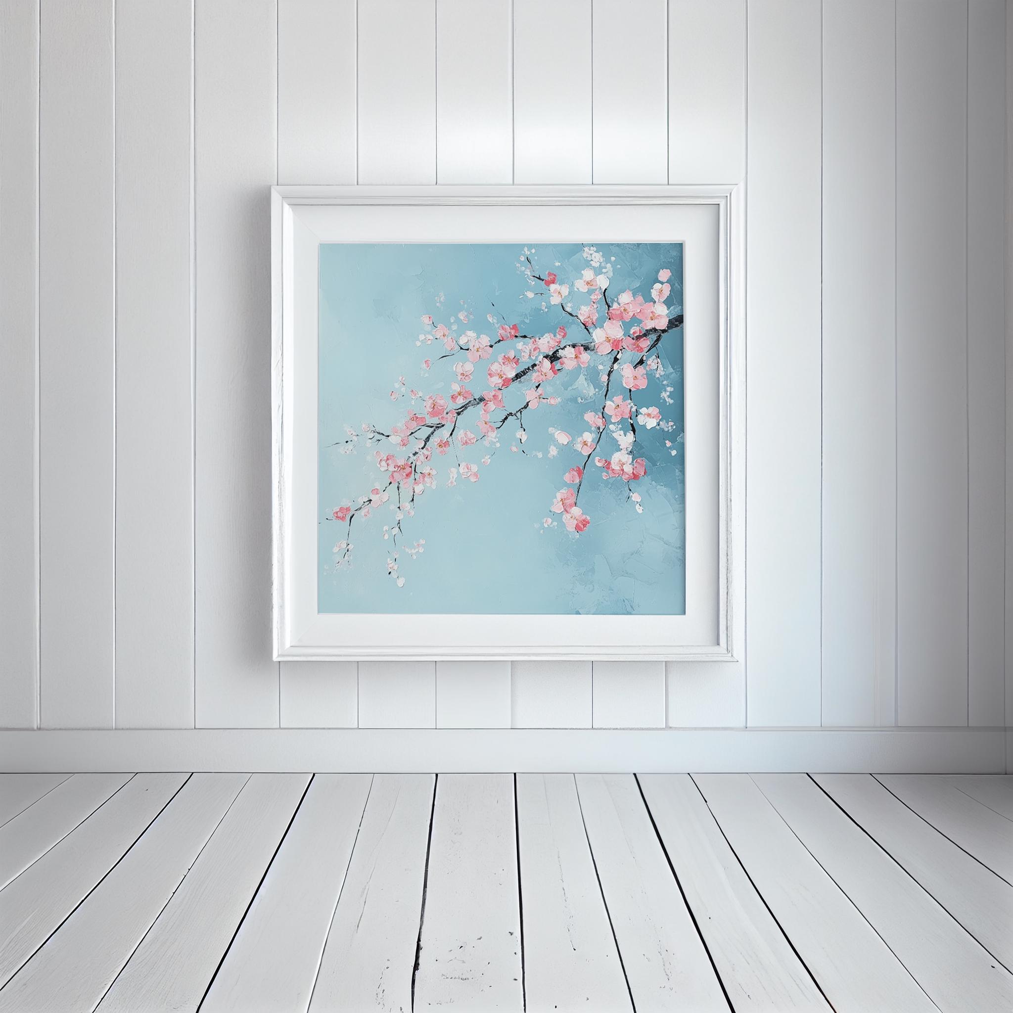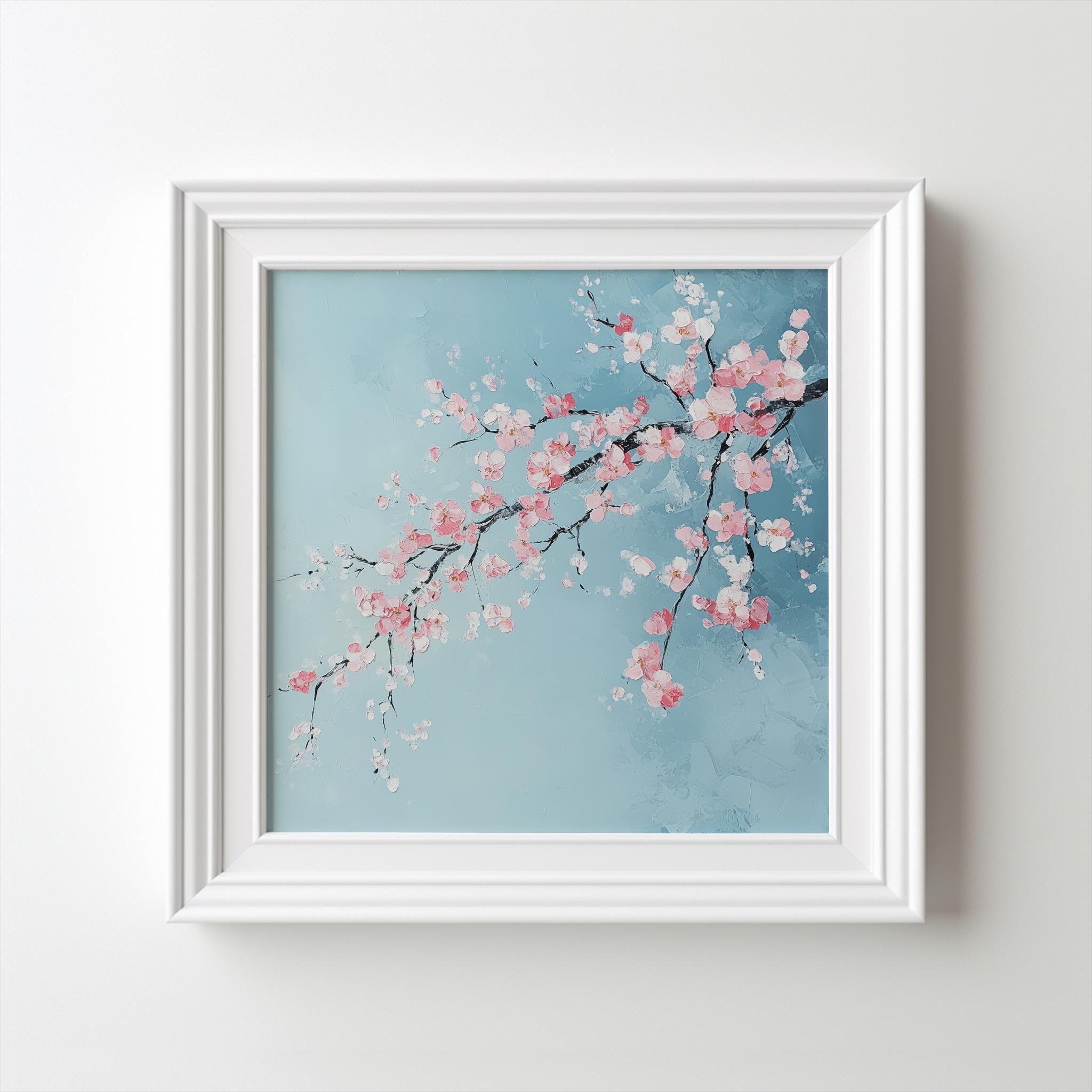 Contemporary Cherry Blossom Painting on a Blue Background. Bring the beauty & wonder of spring into your home with these bright, vibrant & vivid prints. They would be perfect for adding a pop of colour and a touch of whimsy to any room in your home. Available in a variety of sizes, add a little bit of the outdoors to your indoor space!