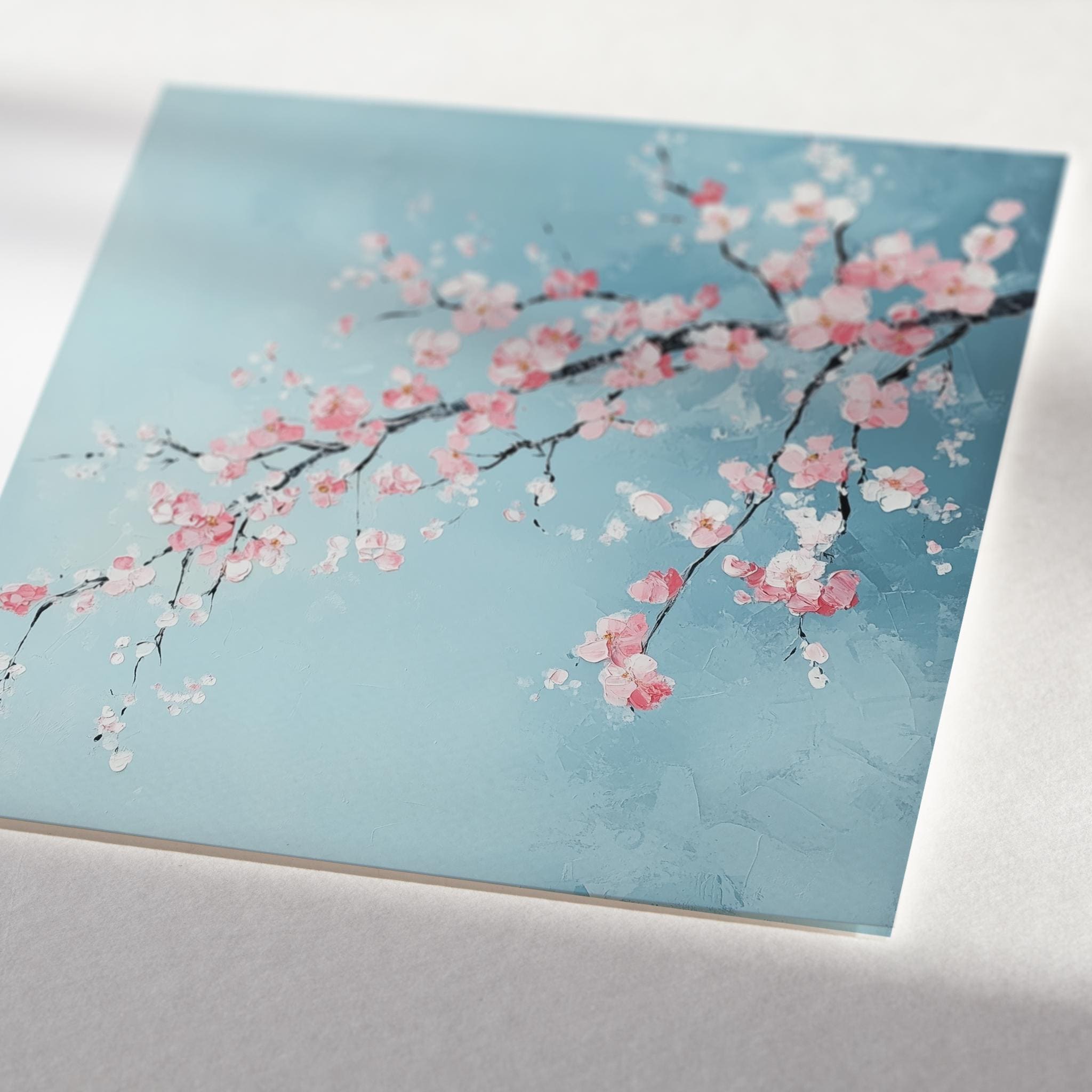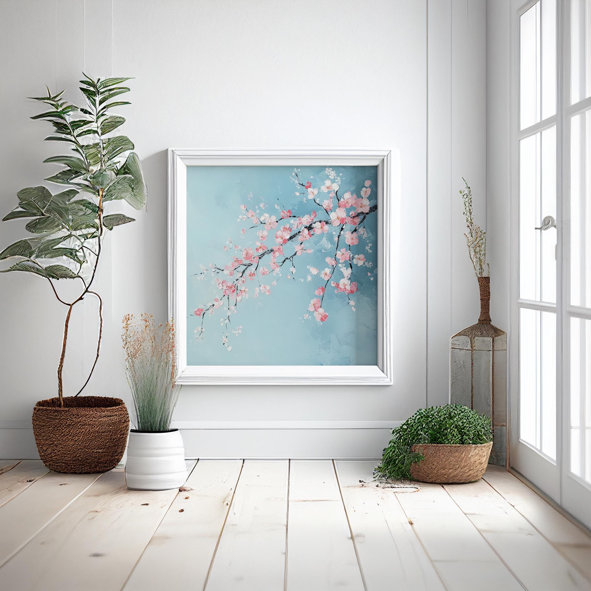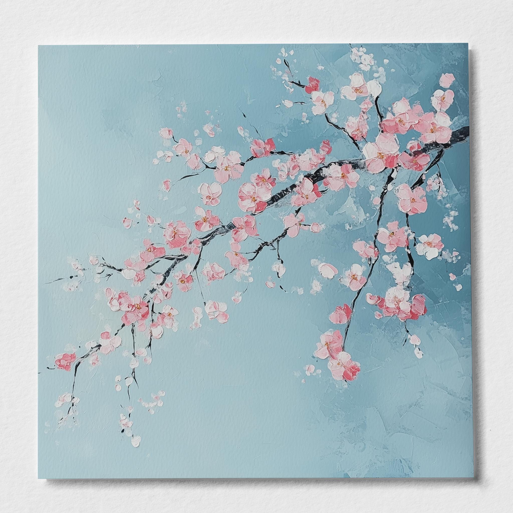 Contemporary Cherry Blossom Painting on a Blue Background. Bring the beauty & wonder of spring into your home with these bright, vibrant & vivid prints. They would be perfect for adding a pop of colour and a touch of whimsy to any room in your home. Available in a variety of sizes, add a little bit of the outdoors to your indoor space!